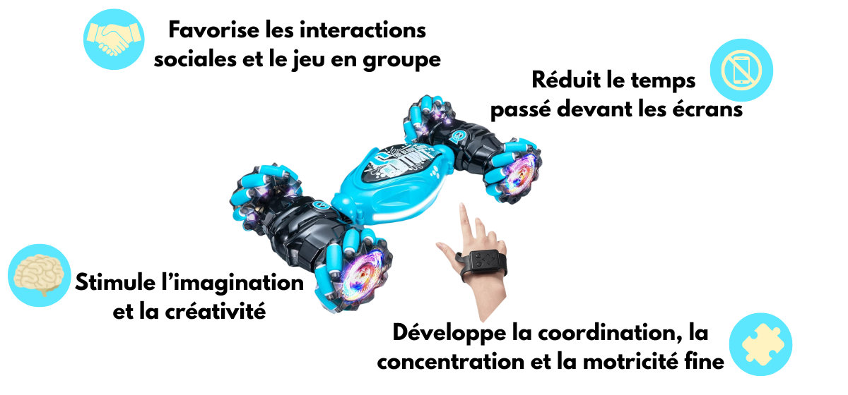 Grâce au bracelet inclus, l’enfant peut contrôler la voiture par de simples mouvements de la main. C’est fluide, sans bouton compliqué, et vraiment spectaculaire !